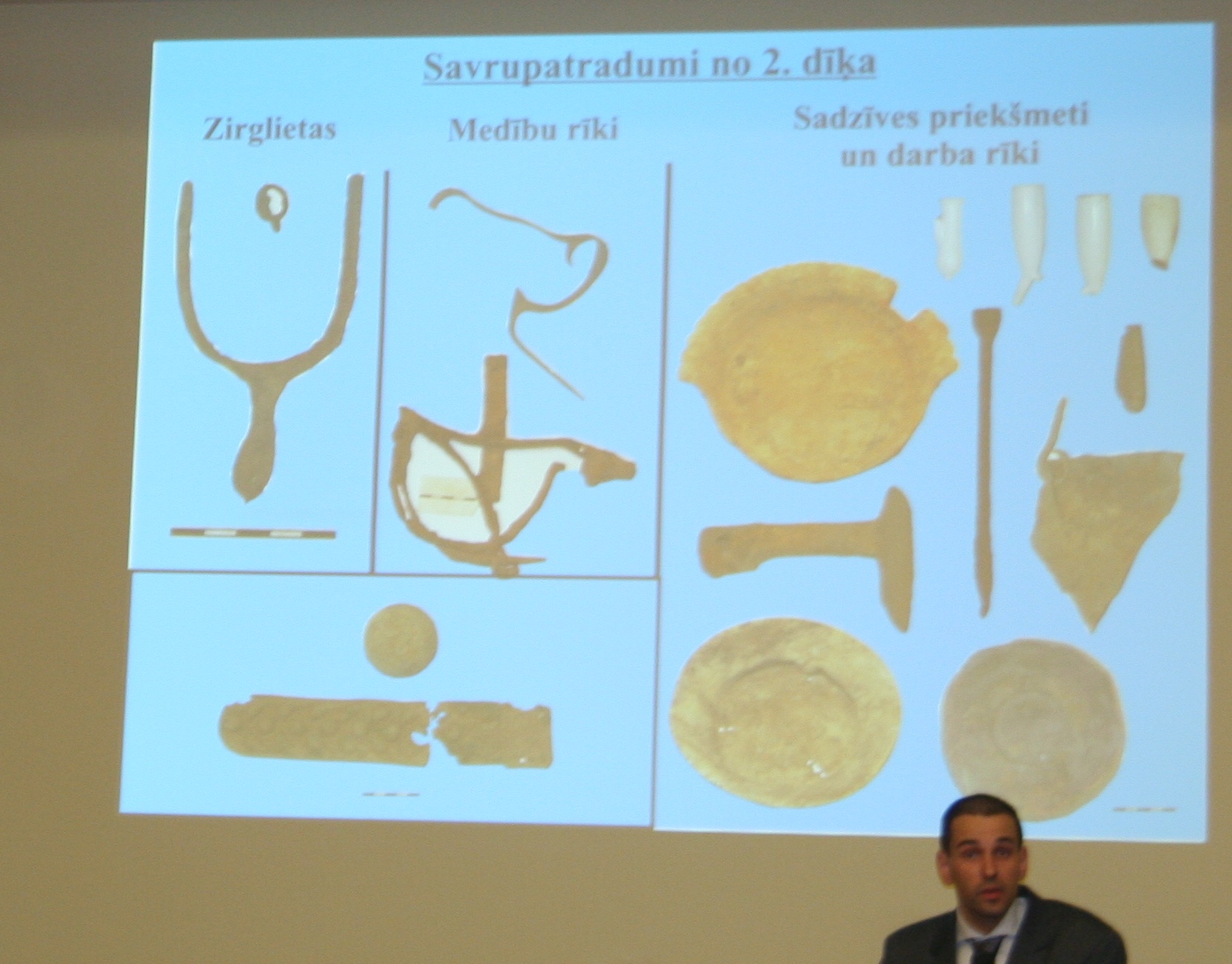 Valdis Bērziņš stāstīja par pētījumiem Priedaines neolīta apmetnē, kas sniegušas spilgtas liecības par apdzīvotību piejūras reģionā akmens laikmeta izskaņā, prof. Andrejs Vasks referēja par pētījumiem Mežītes arheoloģiskajā kompleksā, kur jau vairākus gadus norisinās arī LU VFF arheoloģijas studentu vasaras prakse. Atradumi gan pilskalnā gan kapulaukā sniegušas jaunas vērtīgas jaunas ziņas par apdzīvotību un apbedīšnas tradīcijām Ziemeļkurzemē vēlajā dzelzs laikmetā. R.Spirģa referātā par pētījumiem lībiešu kapulaukā Ogresgala Čabās interesi piesaistīja stāsts par tur atklāto vīrieša apbedījumu ar līdzdotiem veseliem trīs nažiem, kas neizbēgami raisīja asociāciju ķēdi ar “senlatviešu nindzju”. Turklāt pēc antropoloģiskā tipa izrādījās, ka ir šajā reģionā (Daugavas lejtecē) ienācējs – latgalis.