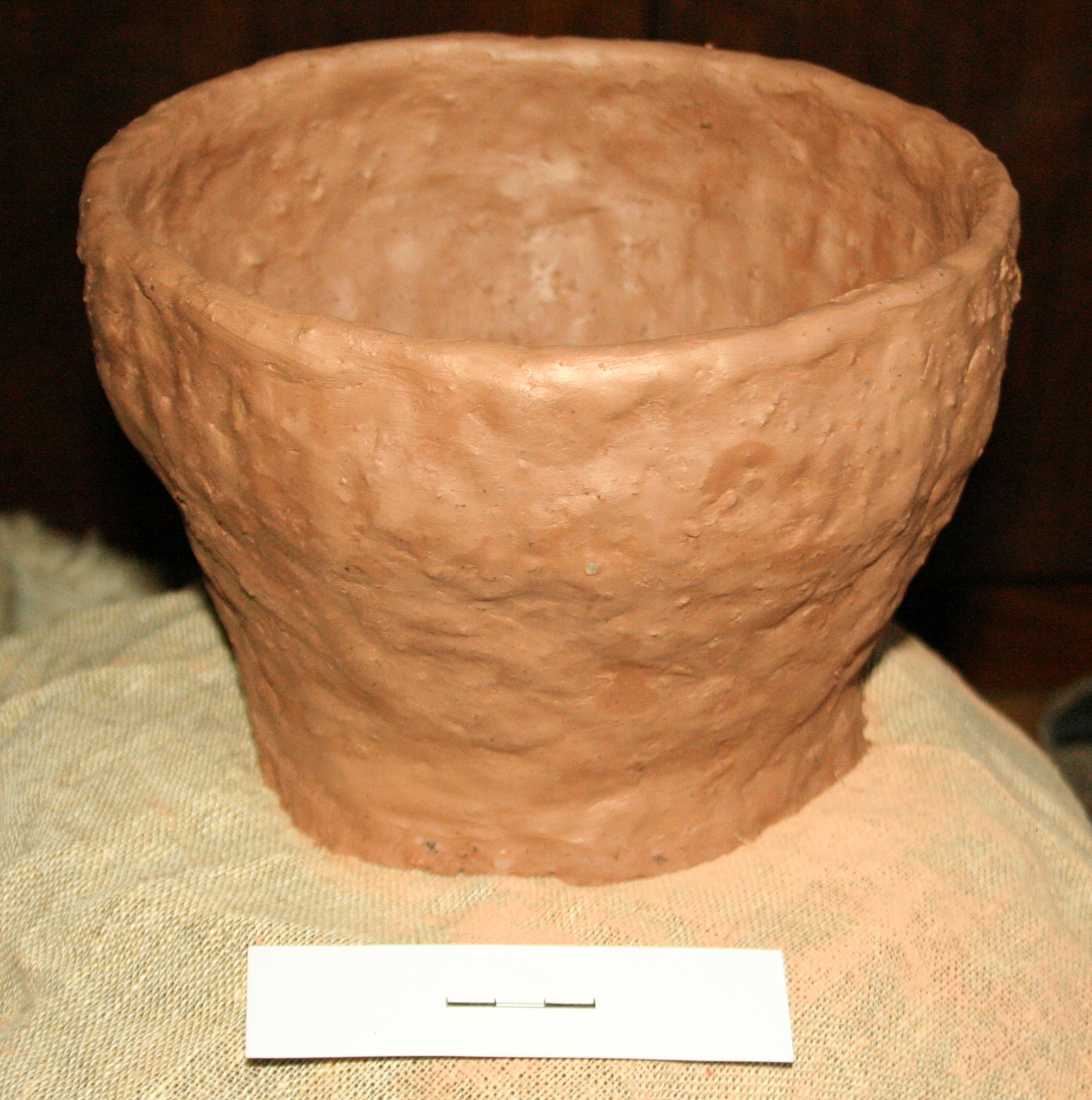 Viena no dzelzs laikmeta iezīmēm ir bezripas keramika. Podnieka ripa Latvijas teritorijā parādās ap 11. gs., tomēr mājsaimniecības vajadzībām māla traukus ilgstoši joprojām gatavo pēc vecajām metodēm. Šeit redzams gludās bezripas keramikas māla poda atdarinājums. Tā tapšanā izmantoti tīri devona māli un vidēji rupji sasmalcināti granīta zvirgzdi. Keramika ar zvirgzdu piejaukumu Latvijā parādās jau bronzas laikmetā, pašu trauku virsma tolaik ir švīkāta vai ar auduma nospiedumu. Trauki ar pilnīgi gludu virsmu lietošanā bijuši pārsvarā dzelzs laikmetā.
