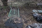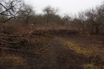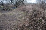 Tāpat arī ir redzams, ka visgrūtāk būs attīrīt zemes gabala centrālo daļu, kurā atrodas nodegušās dārza mājiņas paliekas, jo ugunsgrēkā pirms pāris gadiem šeit izkusa ievērojams daudzums plastmasu. Zeme ap šo vietu ir ļoti piesārņota ar dažādām drazām. Turklāt no liesmām cieta arī divas vistuvāk esošās ābeles, kurām gan apzāģējām atmirušos zarus, bet vai tām izdosies atkopties, laiks rādīs. No lielākajiem un izliektākajiem nozāģētajiem zariem sākām arī pamazām labiekārtot šo vietu, izveidojot improvizētu soliņu.
